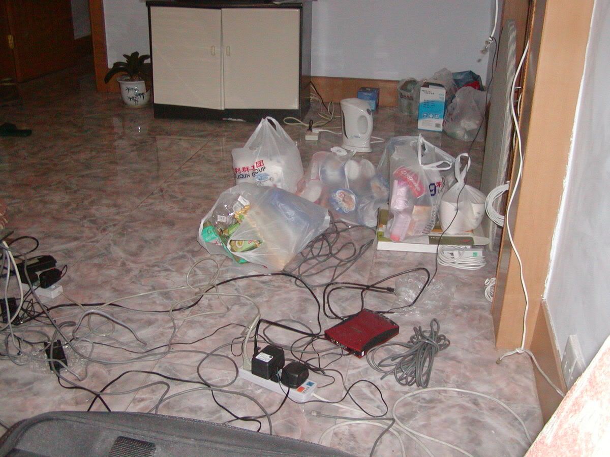 这个是我寝室的一个角落,看上去一定很乱吧。晚上要开发区那边的超市去买东西,都是一些日用品,有杯子、饮料、方便面、零食。满满的堆了一地,这些就是我们五个人一个星期的额外花费了。可能的情况是不要周末就要去第二次。广东同事在饭桌上说,情况不错的话,两个月下来会变肥……汗一个。